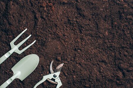 Gardening tools and utensils on soil background. Top view with copy space. Pruner, rake, shovel for garden manteinance. Summer season. Farming, landscaping concept.