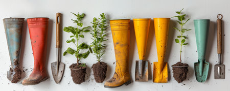 Organic gardening supplies white background, eco-friendly gardening tools, clear display