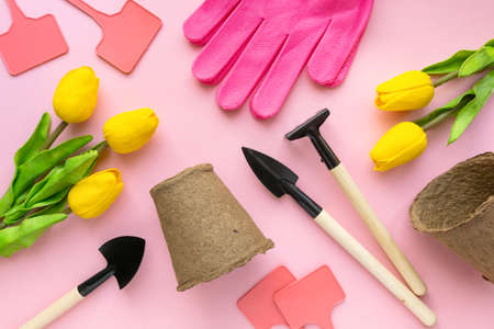 Flat lay of gardening tools. Shovels, seedling pots and gloves on pink background, top view