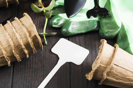 Plastic label for text for home gardening with flower pots and gloves