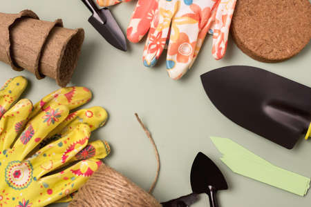 Top view of gardening tools and rope.House plant care concept,frame from tools.