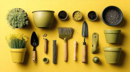 Explore the vibrant arrangement of gardening tools and accessories on a cheerful yellow backdrop, perfect for enthusiasts looking to enhance their indoor or outdoor gardens.
