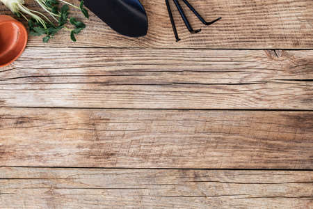 Gardening tools and soil on wooden background. Top view.