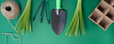 Spring Gardening Tools on Green Background Pots Gloves Coco Substrate Spade Rake Copy Space Mock Up Horizontal