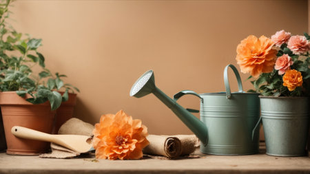 Gardening tools and flowers on wooden table in front of brown wall