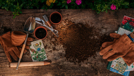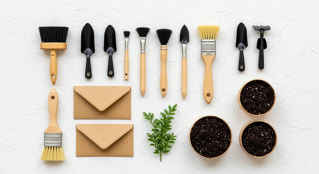 Various gardening implements, soil samples, and small envelopes are neatly arranged for a creative presentation.