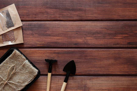 Set for growing microgreen with small spade and rake on a wooden table with copy space. Healthy food and healthy lifestyle concept. Home garden. Vegan food