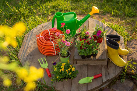 Gardening tools: new watering can, irrigation hose, flower seedlings on wooden boards in garden