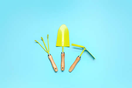 Gardening tools on color background