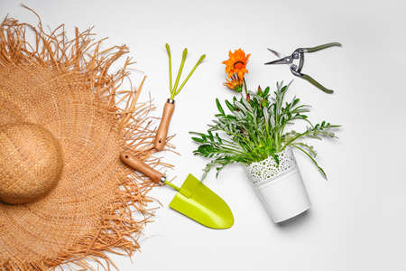 Gardening tools on light background with house plant and gloves,top view