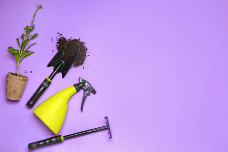 garden supplies and soil and tools on a gray background top view, place for text