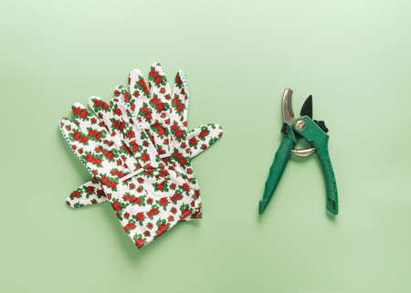 Flower scissors and gloves with small flowers on a green background. Gardening and floristry