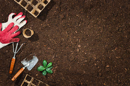 Gardening tools on fertile soil texture background top view.