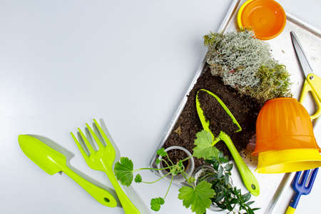 Metal tray with accessories for home gardening and seedlings on a gray background top view, place for text, copy space.