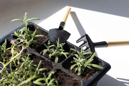 dive seedlings at home, garden at home, lovely hobby gardening, gardening tools and seedlings lie on the table