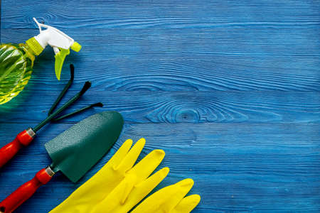flatlay photo of gardener tools with potting soil on the old, blue wood table
