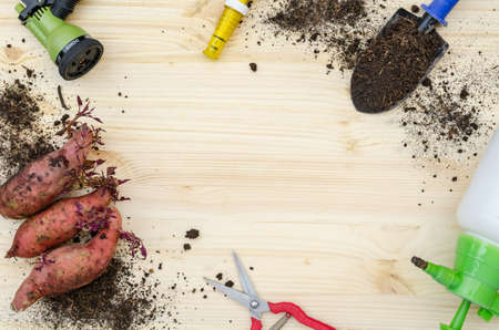 Gardening tools on wooden background