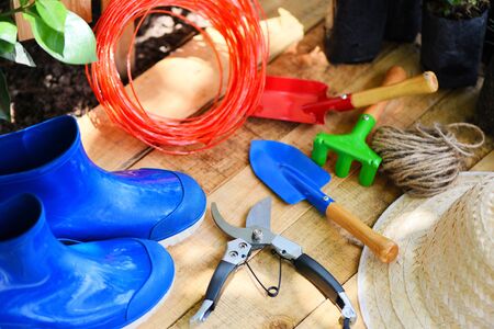Gardening tools on wooden board with pruning shears rope rubber boot garden trowel equipment and straw hat at back yard