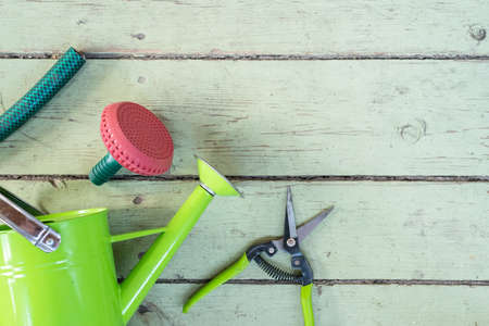 Garden tools on the old green wooden floor background with copy space.