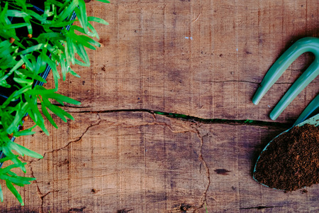 Tools on planting on wood table and farm work with a dream garden.selective focus