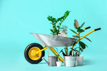 Set of gardening supplies with plant on color background