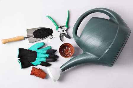 Watering can, pots and gardening tools on light background