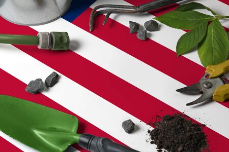 Liberia flag with gardening tools background on table. Spring in the garden concept with free copy space.