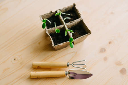 Garden tools and sprouts on wooden table top: gardening trowel and hand fork