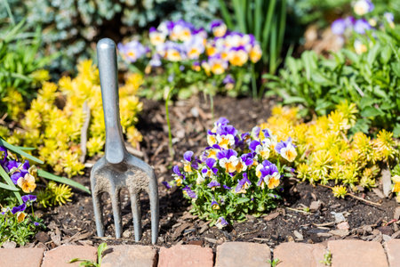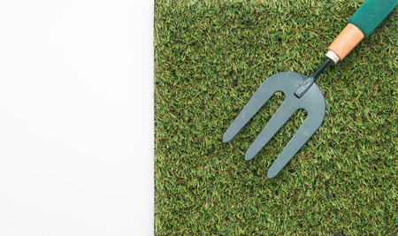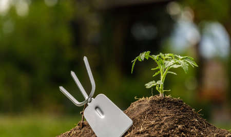 Digging fork in the garden, gardening tool for a gardener, copyspace