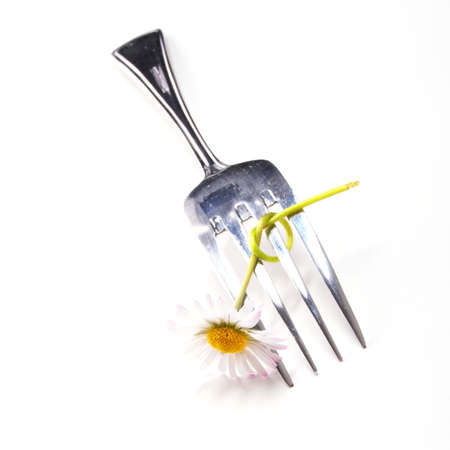 three white disposable white forks in garbage environmental pollution problem with green nature background