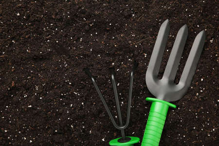 Gardening tools and utensils on soil background. Top view with copy space. Pruner, rake, shovel for garden manteinance. Summer season. Farming, landscaping concept.