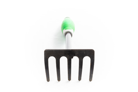 one small gray iron rake with a green plastic handle lies on black ground outside