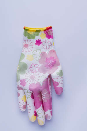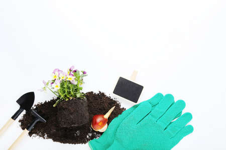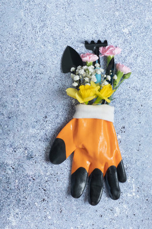 Protective glove with hand tools and flowers. Gardening, planting still life concept. Flat lay, top view.