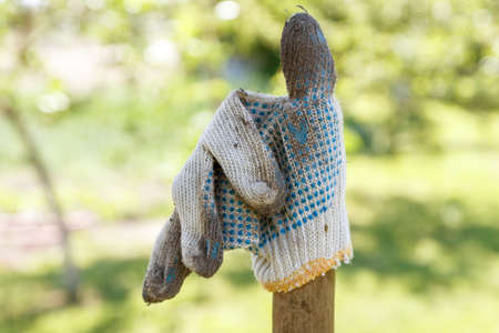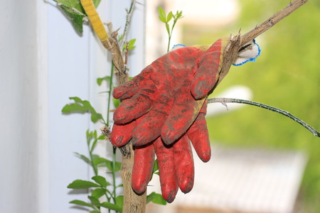 Working glove in a garden is reaching up. The garden is blurred out in the background