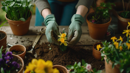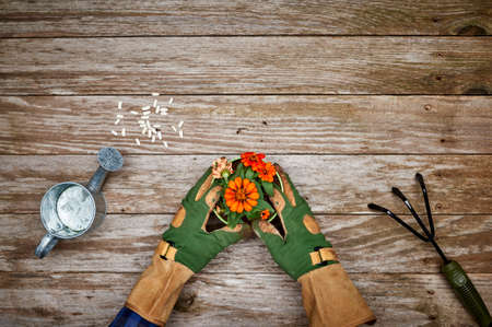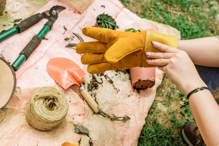 Gardener replanting plant into a new pot. Top view of female hands in gloves planting a plant. Using tools rake and shovel. Real people, authentic situations