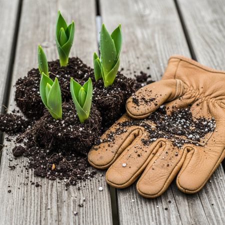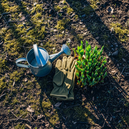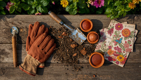 Gardening gloves, a trowel, a watering can, and potted herbs sit on a wooden deck, ready for planting. The composition represents spring gardening preparation, outdoor hobbies, and the cultivation of fresh home-grown plants.