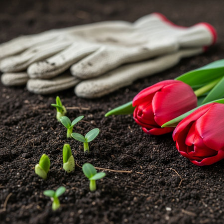 Hands in gloves planting a sprout in garden bed. Hands in colored gardening gloves. Place for text.