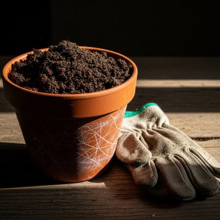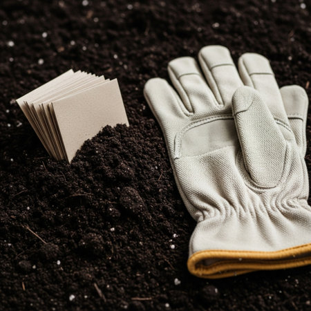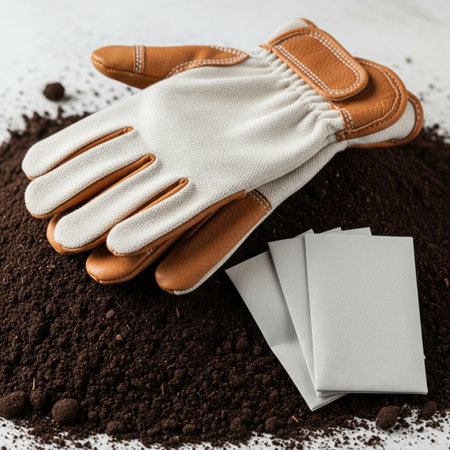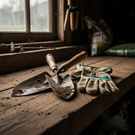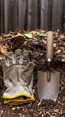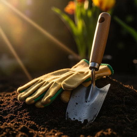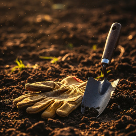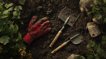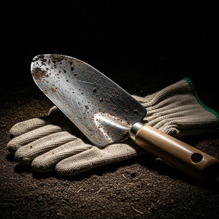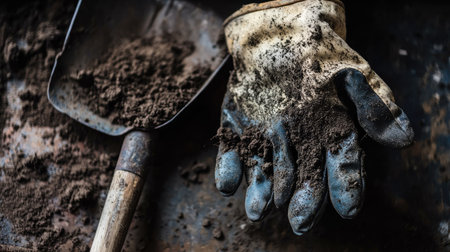 Dirty gloves placed next to a shovel, with fresh dirt visible on both, hinting at recent labor