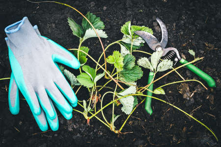 Grower in gloves planted strawberry bush in the ground. Gardening, spring work in the garden.