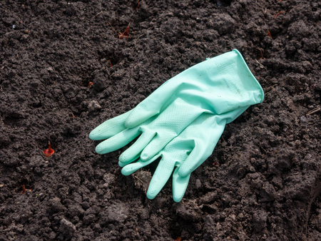 A hand in a latex glove lifting polluted soil filled with microplastics and debris. Minimal pollution and environmental protection concept. Copy space.