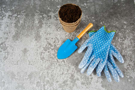 Blue shovel, garden gloves, pot with soil over grey cement surface. Planting concept.