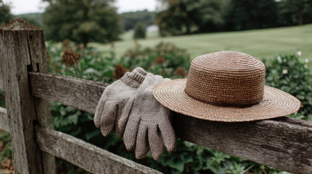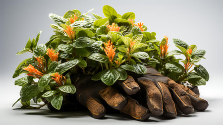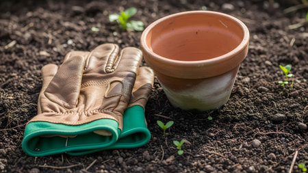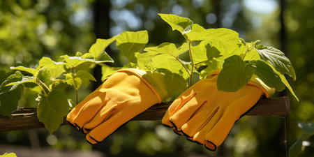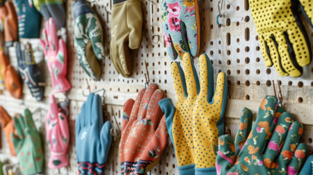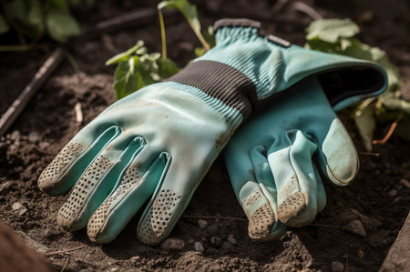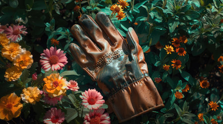 A captivating scene featuring dirty green gardening gloves resting on a bright, vibrant floral background, showcasing the beauty of nature and creativity.