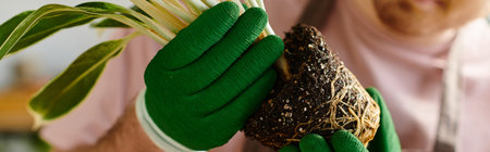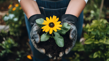Unrecognizable female gardener holding beautiful flower ready to be planted in a garden. Gardening concept. Garden Landscaping small business banner.