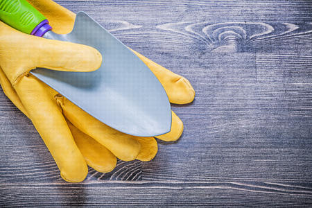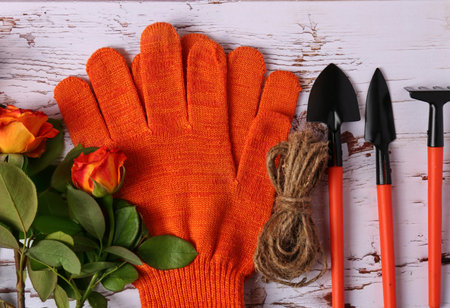Leather gardening gloves hand spade and rake on wooden board agriculture concept.