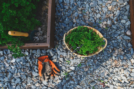 growing and harvesting parsley in veggie garden. Natural country life and healthy organic food