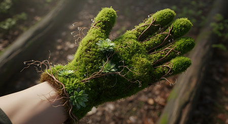 A man wearing gloves carefully plants a young seedling in rich soil, promoting environmental care and reforestation in a lush forest setting.