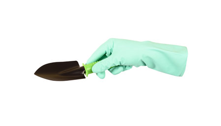 A hand in a protective glove holds a garden shovel with soil. Isolated on white with saved path.