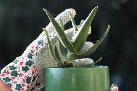 A vibrant hand wearing colorful gardening gloves gently tends to potted snake plants in a warm, sunlit environment