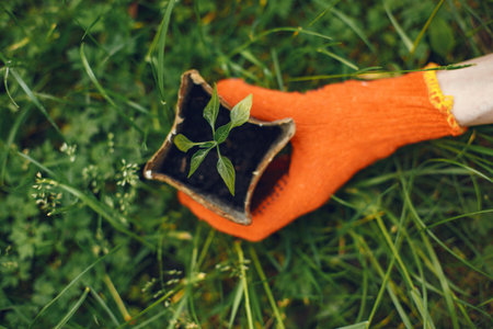 Plant a small sprout in a brown pot. Plant transplants. Military-style gloves.