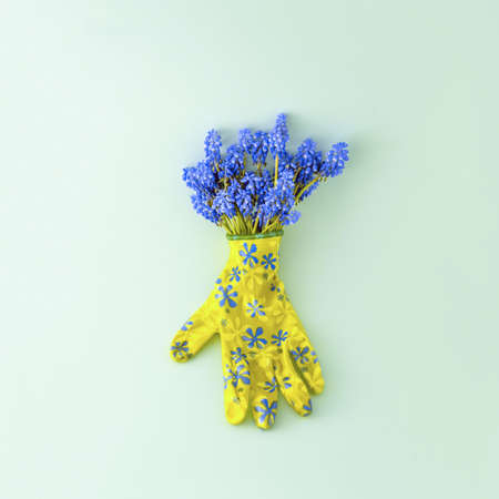 Hands in orange gloves plant blue flowers in the ground. Daffodils. Agriculture, gardening, agronomy. Green consumption concept. Conservation of nature, ecology. Caring, love for plants and flowers.